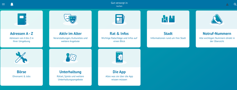 Bereits seit mehreren Jahren auf dem Markt und inzwischen in über 60 deutschen Städten erfolgreich etabliert, steht die kostenfreie Gesundheits- und Senioren-App „Gut versorgt in …“ auch allen Bürger*innen in Aachen kostenlos zur Verfügung. Die App bietet eine Vielzahl an Orientierungshilfen und Informationen aus und zu Aachen.
