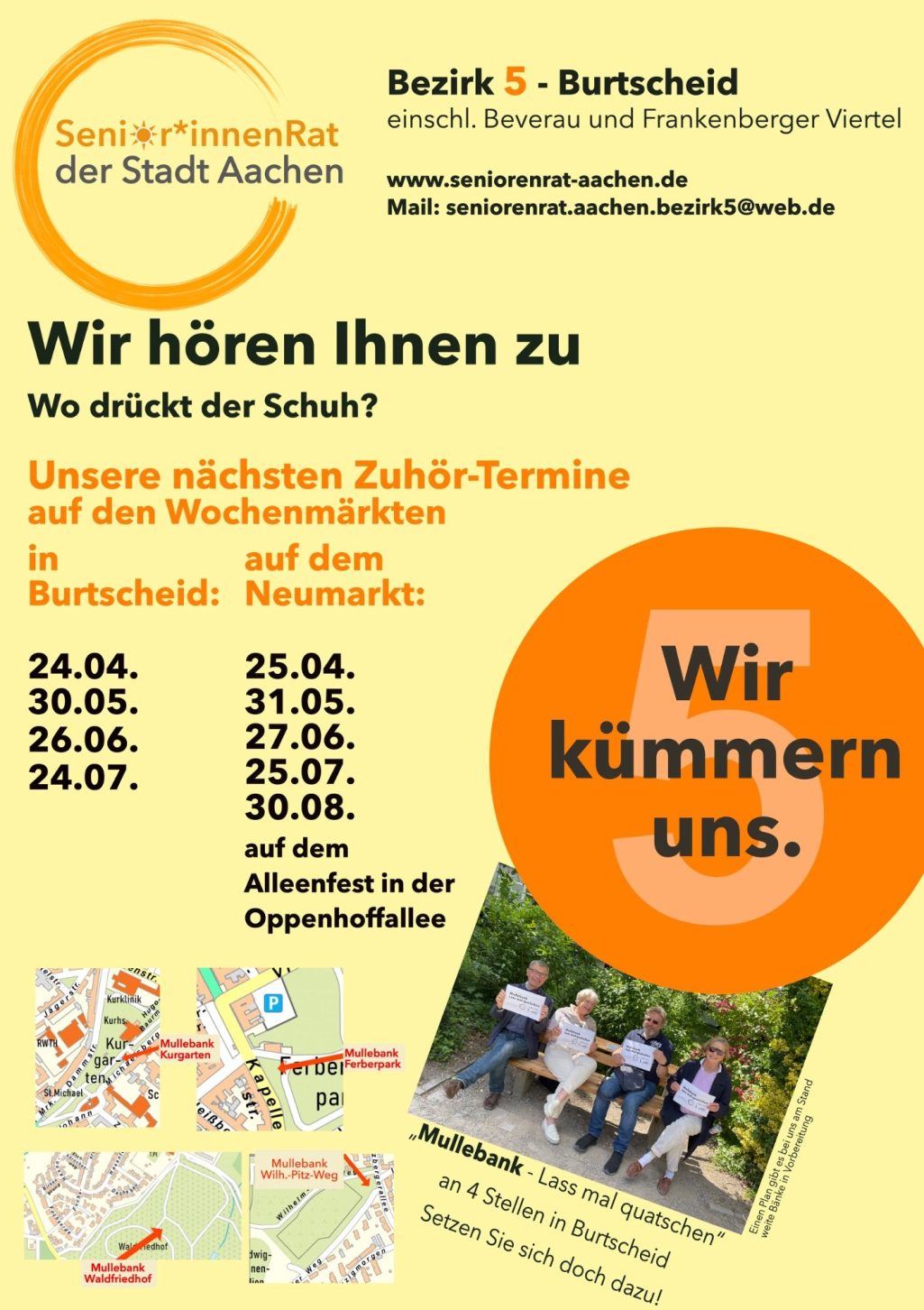 Da der Sozialraum Burtscheid zum Bezirk Aachen-Mitte gehört, gibt es hierfür keine differenzierten Zahlen. Ausgehend von ca. 24.000 Bewohner in Burtscheid-Mitte (ca. 11.000), Frankenberger Viertel (ca. 9.000) und Beverau (ca. > 4.000) sind es damit unter Einbeziehung der Altersgruppe 60 – 65 Jahre (ca. 5%) fast 5.000 Senior*innen, für die wir uns einsetzen.