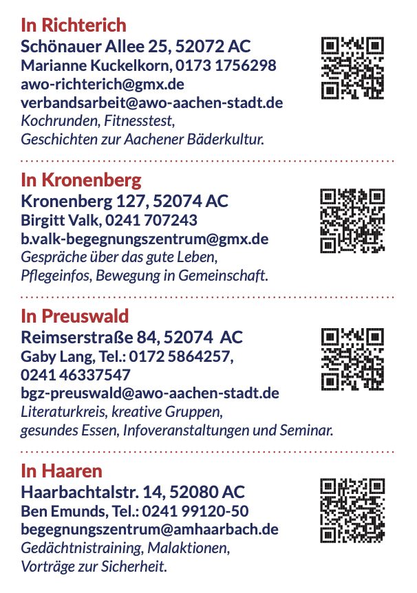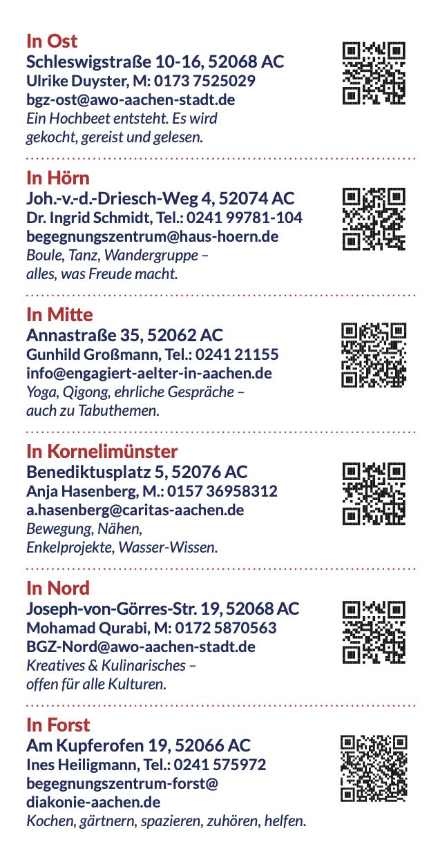 Der Seniorenrat Burtscheid hat versucht, alle regelmäßigen Termine im Bezirk für die Generation 50+ zusammenzustellen. Die Auswahl ist ohne Gewähr. Bitte kontaktieren Sie vorher die Kontakte aus der Spalte "weitere Infos".